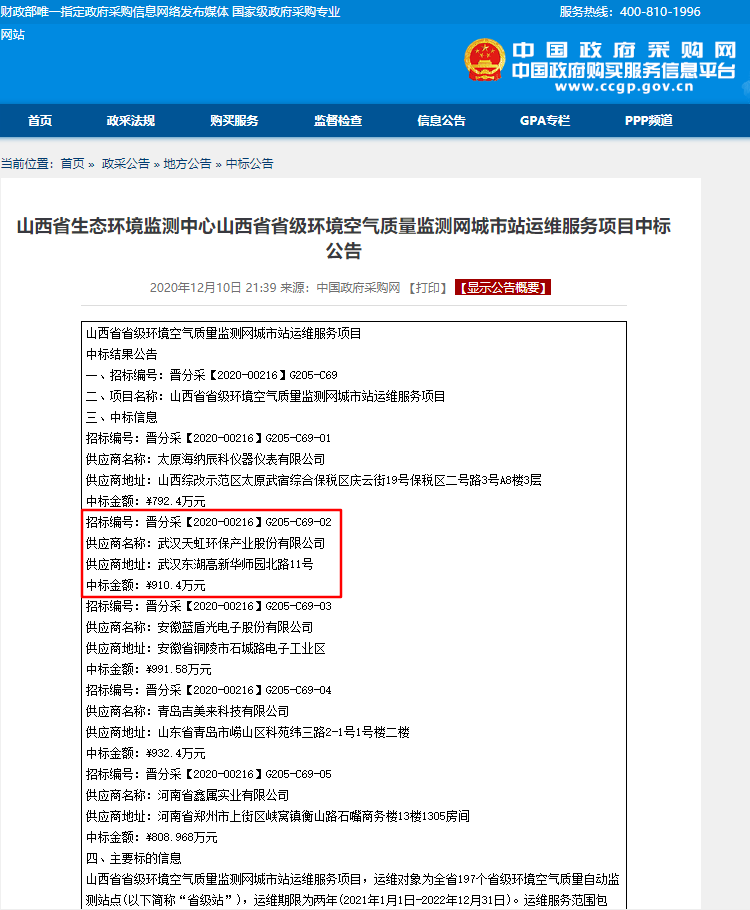 2020年12月10日,武漢天虹環(huán)保產(chǎn)業(yè)股份有限公司成功中標(biāo)“山西省省級(jí)環(huán)境空氣質(zhì)量監(jiān)測(cè)網(wǎng)城市站運(yùn)維服務(wù)項(xiàng)目”(第2包),項(xiàng)目金額910.4萬(wàn)元。運(yùn)維服務(wù)城市包含忻州和呂梁20個(gè)縣(區(qū)、市)共計(jì)40個(gè)運(yùn)維站點(diǎn);運(yùn)維服務(wù)范圍包括:各省級(jí)站所有監(jiān)測(cè)儀器(PM10、PM2.5、NOx、SO2、O3、CO)、氣象儀器、質(zhì)控設(shè)備(零氣發(fā)生器、動(dòng)態(tài)校準(zhǔn)儀)、數(shù)據(jù)采集與傳輸設(shè)備、輔助設(shè)備、防雷、消防等基礎(chǔ)設(shè)施的日常維護(hù)、質(zhì)量控制、故障維修、年度檢修、檢定等工作,以及站房租賃與維護(hù)、站房運(yùn)行電費(fèi)、視頻監(jiān)控、網(wǎng)絡(luò)通訊保障,并負(fù)擔(dān)相應(yīng)費(fèi)用,并須接受山西省生態(tài)環(huán)境廳和山西省生態(tài)環(huán)境監(jiān)測(cè)中心的質(zhì)控檢查和考核,確保省級(jí)站各項(xiàng)監(jiān)測(cè)儀器正常穩(wěn)定運(yùn)行并與省、市、縣環(huán)保部門聯(lián)網(wǎng)正常;運(yùn)維服務(wù)期2年。