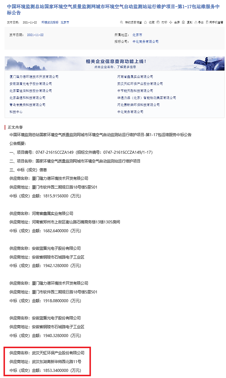 2021年11月22日,武漢天虹環(huán)保產業(yè)股份有限公司中標“國家環(huán)境空氣質量監(jiān)測網城市環(huán)境空氣自動監(jiān)測站《以下簡稱(國控城市點位)》運行維護項目”第6包(中標金額1853.34萬元,覆蓋安徽、河北、山東3省21個城市的115個國控城市站);第9包(中標金額1719.744萬元,覆蓋河南、福建2省18個城市的104個國控城市站)。