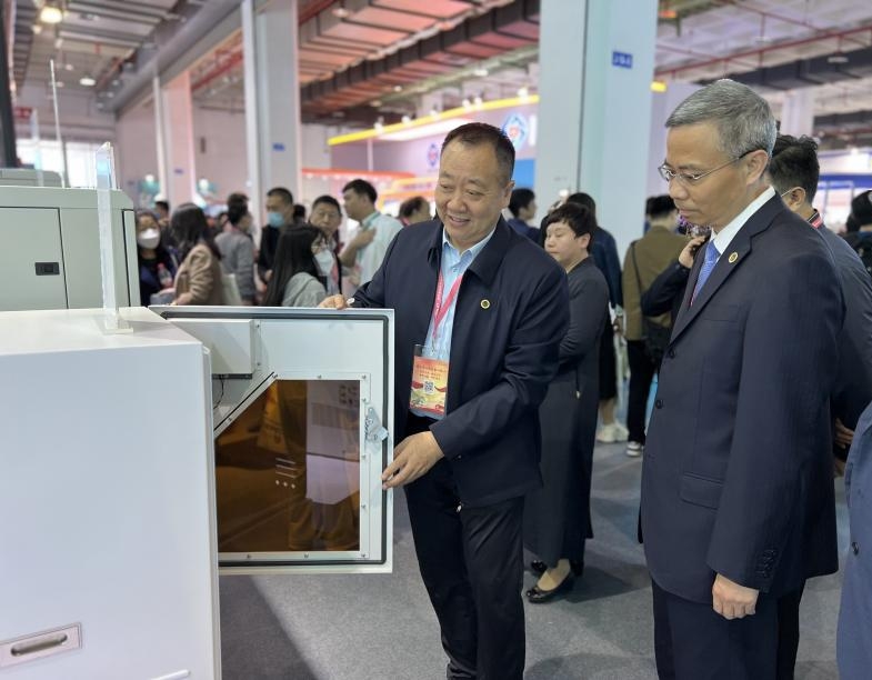 公司李總向省生態(tài)環(huán)境廳廳長(zhǎng)何開(kāi)文展示我司最新研發(fā)產(chǎn)品