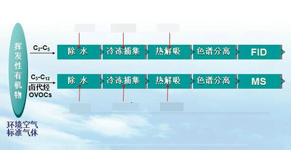 環(huán)境大氣通過(guò)采樣系統(tǒng)采集后,進(jìn)入濃縮系統(tǒng),在超低溫條件下,大氣中的揮發(fā)性有機(jī)物在空毛細(xì)管捕集柱中被冷凍捕集;然后快速加熱解析,使化合物進(jìn)入GCMS分析系統(tǒng);經(jīng)色譜柱分離后被FID和MS檢測(cè)器檢測(cè)。