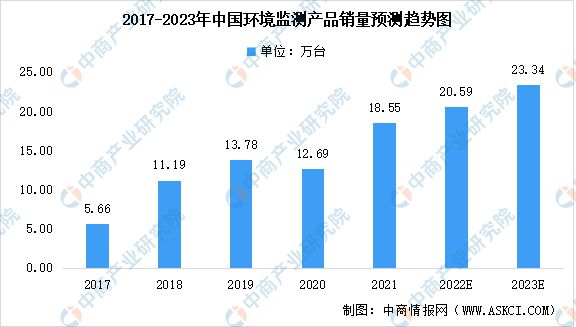 根據(jù)中國(guó)環(huán)境保護(hù)產(chǎn)業(yè)協(xié)會(huì)統(tǒng)計(jì)數(shù)據(jù),2017-2021年我國(guó)環(huán)境監(jiān)測(cè)產(chǎn)品的銷(xiāo)量及增長(zhǎng)率整體處于上升趨勢(shì),2020年受到疫情影響,環(huán)保項(xiàng)目開(kāi)工率、工時(shí)、完工率等指標(biāo)均受到不利影響,但市場(chǎng)規(guī)模仍維持在高位。2021年我國(guó)環(huán)境監(jiān)測(cè)產(chǎn)品的銷(xiāo)量達(dá)18.55萬(wàn)臺(tái),預(yù)計(jì)2023年我國(guó)環(huán)境監(jiān)測(cè)產(chǎn)品的銷(xiāo)量將達(dá)23.34萬(wàn)臺(tái)。